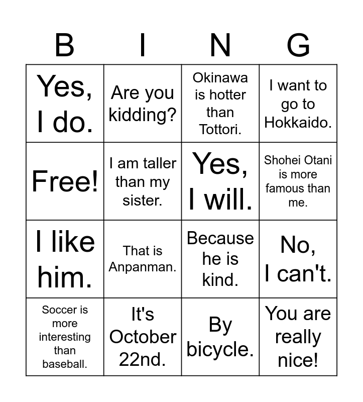 This bingo card has 16 words: It's October 22nd., No, I can't., Okinawa is hotter than Tottori., Yes, I do., I like him., Are you kidding?, Because he is kind., By bicycle., Free!, I am taller than my sister., Soccer is more interesting than baseball., I want to go to Hokkaido., That is Anpanman., Shohei Otani is more famous than me., Yes, I will. and You are really nice!.
