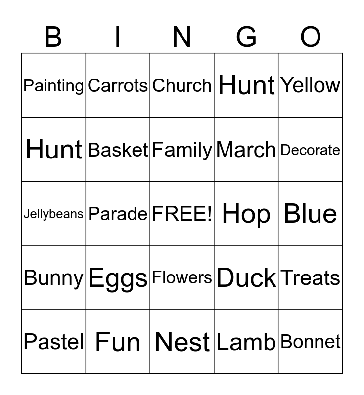 This bingo card has a free space and 24 words: Eggs, Fun, Family, Pastel, Yellow, Painting, Hunt, Carrots, Hop, Flowers, March, Jellybeans, Duck, Treats, Basket, Lamb, Blue, Church, Decorate, Parade, Bonnet, Bunny, Hunt and Nest.
