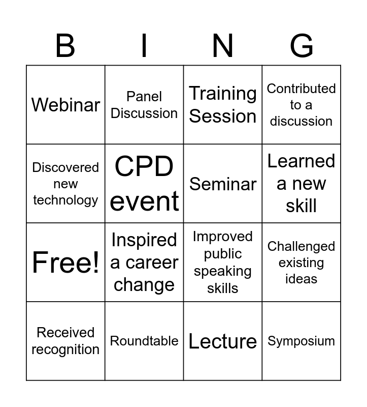 This bingo card has 27 words: Annual Conference, Workshop, Seminar, Networking Event, Webinar, Panel Discussion, Training Session, Symposium, Free!, Roundtable, Lecture, Learned a new skill, Made a valuable connection, Gained industry insights, Improved public speaking skills, Found a mentor/mentee, Discovered new technology, Inspired a career change, Solved a work-related problem, Contributed to a discussion, Received recognition, Collaborated on a project, Enhanced Leadership abilities, Challenged existing ideas, Gained confidence in a specific area, CPD event and Expanded Professional Network.