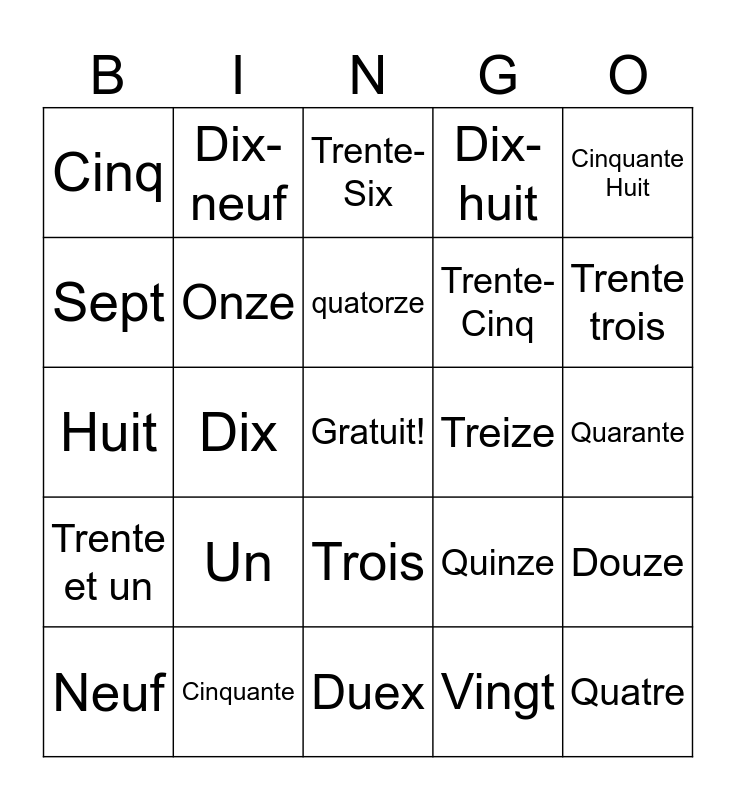 This bingo card has a free space and 29 words: Neuf, Vingt-Neuf, Dix, Vingt Deux, Cinq, Trente-Six, Onze, Un, Treize, Cinquante, Quarante, Quatre, Duex, Vingt, Trente trois, Seize, Trois, Trente et un, Cinquante Huit, Huit, Quinze, Trente, Trente-Cinq, Sept, Dix-huit, Dix-neuf, Douze, quatorze and quarante-quatre.