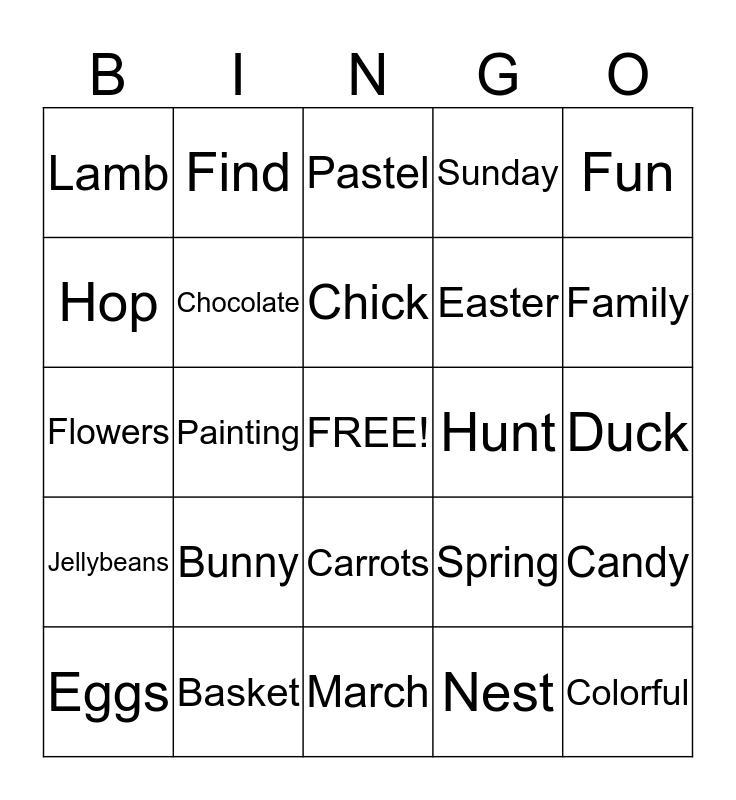 This bingo card has a free space and 24 words: Bunny, Basket, Chick, Eggs, Fun, Lamb, Hop, Find, Hunt, Carrots, Easter, Flowers, Spring, Candy, Chocolate, Nest, Duck, Pastel, Family, Painting, Colorful, Jellybeans, Sunday and March.