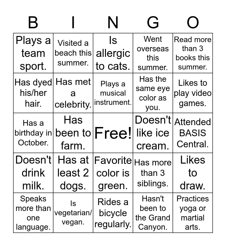This bingo card has a free space and 24 words: Has at least 2 dogs., Is vegetarian/ vegan., Plays a musical instrument., Speaks more than one language., Read more than 3 books this summer., Plays a team sport., Has dyed his/her hair., Visited a beach this summer., Doesn't like ice cream., Favorite color is green., Has the same eye color as you., Has a birthday in October., Has more than 3 siblings., Likes to draw., Has met a celebrity., Hasn't been to the Grand Canyon., Attended BASIS Central., Is allergic to cats., Likes to play video games., Has been to farm., Practices yoga or martial arts., Doesn't drink milk., Went overseas this summer. and Rides a bicycle regularly..