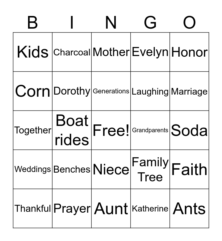 This bingo card has a free space and 50 words: Anniversaries, Ants, August, Aunt, Benches, Brothers, Charcoal, Children, Corn, Descendants, Dorothy, Evelyn, Faith, Family Tree, Friendship, Fun, Generations, Grandparents, Gwendolyn, Honor, Boat rides, Katherine, Kids, Laughing, Lineage, Love, Marriage, Memories, Mother, Niece, Pauline, Picnic, Play, Potato Salad, Prayer, Prizes, Relative, Respect, Putt Putt golf, Soda, Son, Spades, Summer, Support, Thankful, Together, Trust, Twins, Weddings and Wife.