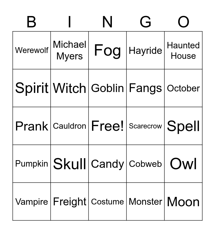 This bingo card has a free space and 39 words: Spooky, Ghoul, Jack-O-Lantern, Witch, Vampire, Candy, Goblin, Boo, Haunted House, Pumpkin, Cauldron, Hayride, Moon, Spell, Scarecrow, Skull, Trick or Treat, Werewolf, Zombie, Cobweb, Spirit, Costume, Fangs, October, Raven, Mask, Frankenstein, Mummy, Scream, Michael Myers, Freddie Krueger, Cemetery, Fog, Freight, Monster, Mystery, Owl, Prank and Gore.