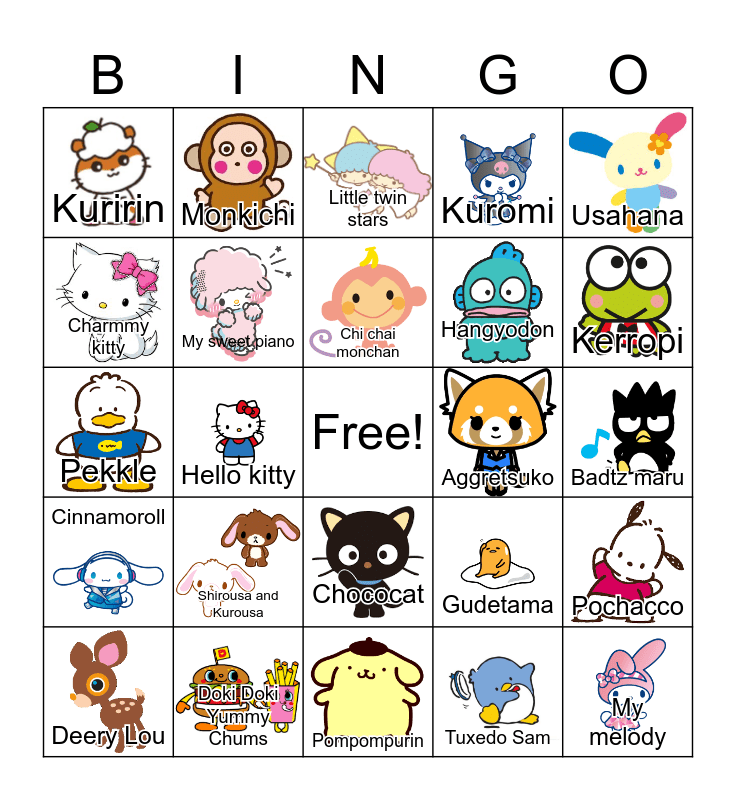 This bingo card has 24 images, a free space and 24 words: Shirousa and Kurousa, Doki Doki Yummy Chums, Chi chai monchan, Deery Lou, Usahana, Kuririn, Charmmy kitty, Monkichi, Aggretsuko, Chococat, Hangyodon, Pekkle, Gudetama, Pochacco, My sweet piano, Tuxedo Sam, Badtz maru, Little twin stars, Kerropi, Hello kitty, My melody, Cinnamoroll, Kuromi and Pompompurin.