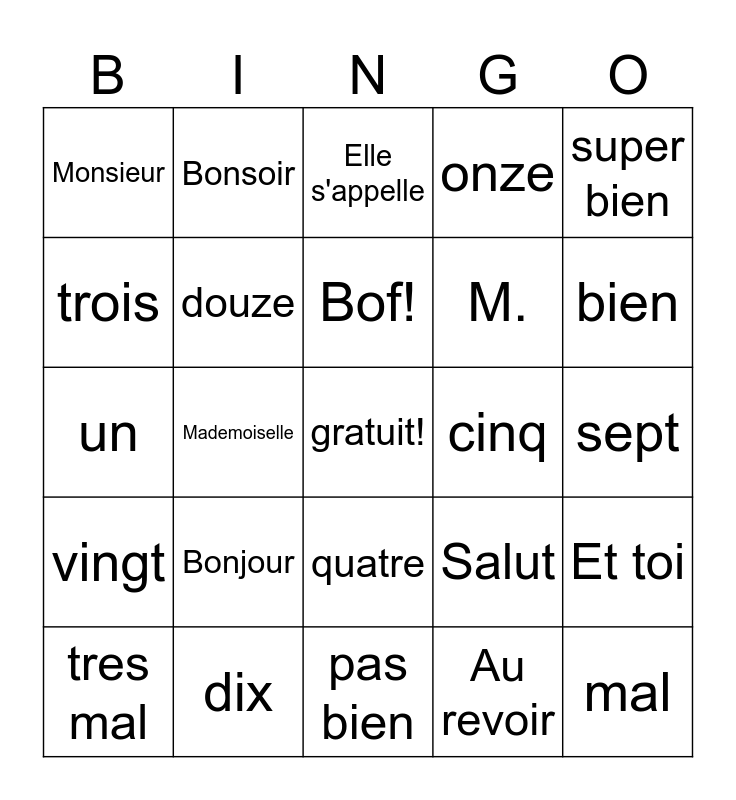 This bingo card has a free space and 24 words: Bonjour, dix, Bof!, tres mal, super bien, Monsieur, trois, Bonsoir, cinq, quatre, M., un, Salut, Et toi, douze, Au revoir, sept, Elle s'appelle, bien, Mademoiselle, mal, vingt, onze and pas bien.