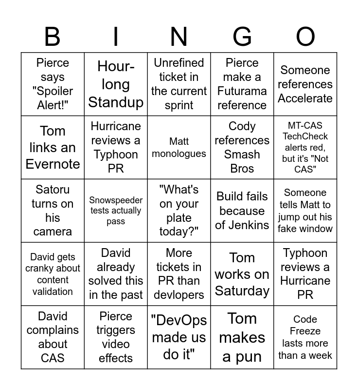 This bingo card has a free space and 24 words: David already solved this in the past, Pierce triggers video effects, Matt monologues, David complains about CAS, Someone references Accelerate, Pierce says "Spoiler Alert!", Tom links an Evernote, Hour-long Standup, Build fails because of Jenkins, More tickets in PR than devlopers, Cody references Smash Bros, Satoru turns on his camera, Tom works on Saturday, Typhoon reviews a Hurricane PR, Hurricane reviews a Typhoon PR, Tom makes a pun, Someone tells Matt to jump out his fake window, Unrefined ticket in the current sprint, MT-CAS TechCheck alerts red, but it's "Not CAS", Snowspeeder tests actually pass, Code Freeze lasts more than a week, David gets cranky about content validation, Pierce make a Futurama reference and "DevOps made us do it".
