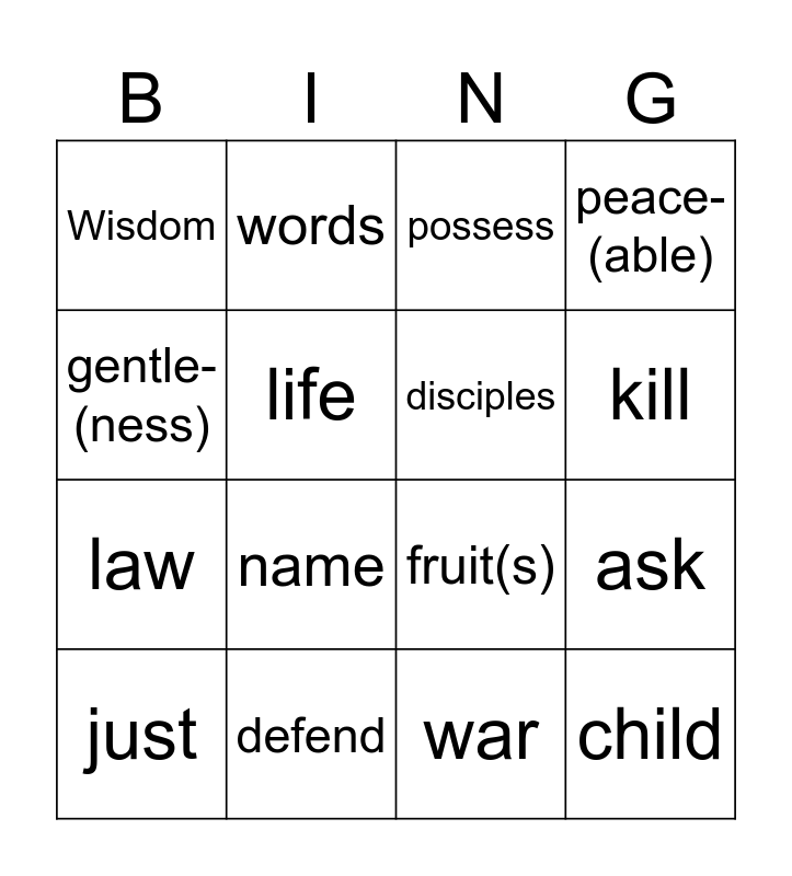 This bingo card has 16 words: just, defend, possess, peace- (able), gentle- (ness), words, fruit(s), ask, Wisdom, life, war, kill, law, name, disciples and child.