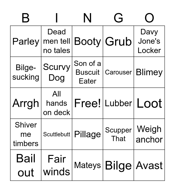 This bingo card has a free space and 44 words: Ahoy, Avast, Aye, Bail out, Belay, Bilge, Booty, Chew the fat, Davy Jone's Locker, Fair winds, Grub, Lubber, Pillage, Scuttlebutt, Scallywags, Mateys, Arrr, Arrgh, Gar, Blimey, Dead men tell no tales, Heave, I'll Crush Ye Barnacles, Parley, Prize, Loot, Run a Shot across the Bow, Savvy, Scupper That, Shiver me timbers, Walk the plank, Weigh anchor, Yo-ho-ho, Raise the Jolly Roger, All hands on deck, Fire in the hole, Heave Ho, Scourge of the 7 seas, Son of a Buscuit Eater, Bilge-sucking, Carouser, Landlubber, Scurvy Dog and Ahoy, me hearties.