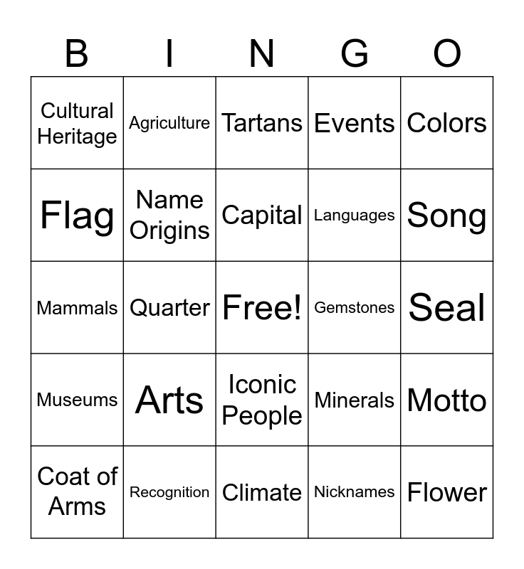 This bingo card has a free space and 24 words: Arts, Recognition, Capital, Coat of Arms, Colors, Cultural Heritage, Flag, Agriculture, Gemstones, Iconic People, Languages, Mammals, Minerals, Motto, Name Origins, Nicknames, Seal, Tartans, Song, Quarter, Flower, Museums, Events and Climate.