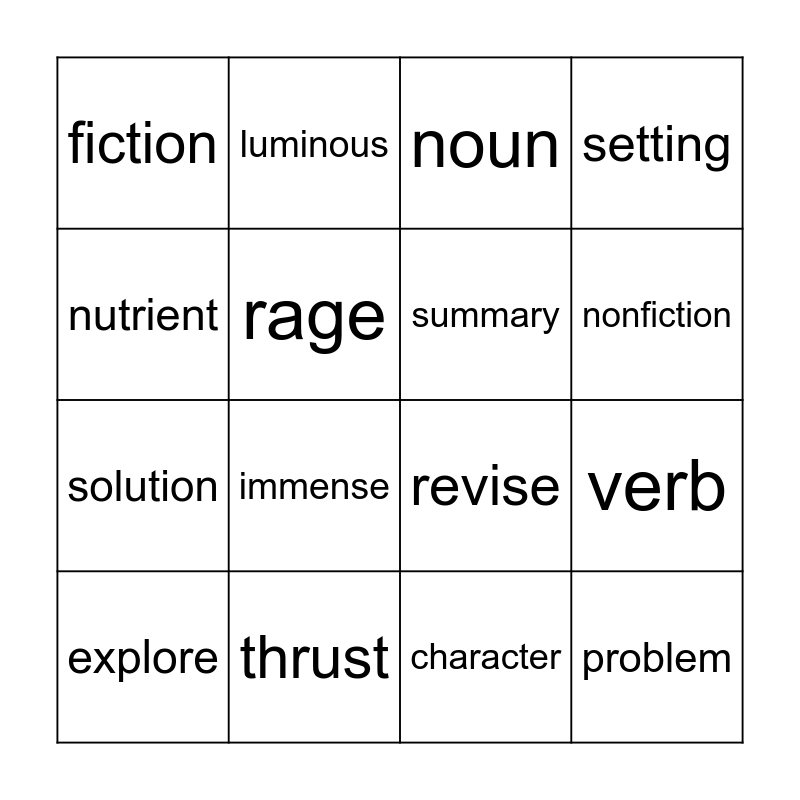 This bingo card has 20 words: explore, shoon, noun, verb, speck, immense, character, setting, solution, luminous, revise, nonfiction, fiction, thrust, summary, biography, nutrient, rage, overwhelmed and problem.