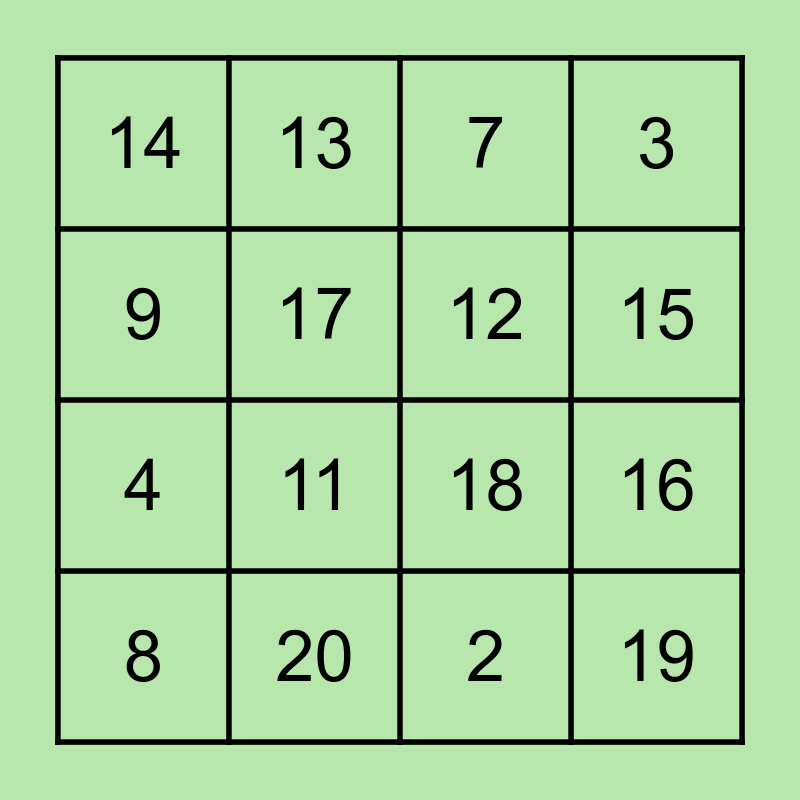 This bingo card has 16 words: 20, 16, 7, 14, 4, 13, 18, 2, 9, 17, 8, 3, 11, 15, 12 and 19.