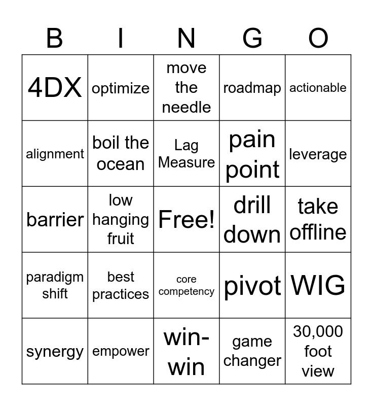 This bingo card has a free space and 29 words: synergy, circle back, low hanging fruit, think outside the box, 4DX, move the needle, boil the ocean, best practices, drill down, empower, take offline, 30,000 foot view, win-win, game changer, leverage, value add, core competency, paradigm shift, actionable, barrier, pivot, bandwidth, pain point, alignment, roadmap, optimize, WIG, Lag Measure and Lead Measure.