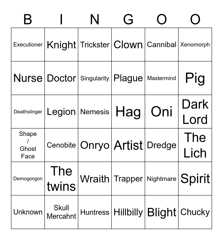 This bingo card has 36 words: Trapper, Wraith, Hillbilly, Nurse, Shape / Ghost Face, Hag, Doctor, Huntress, Cannibal, Nightmare, Pig, Clown, Spirit, Legion, Plague, Executioner, Demogorgon, Oni, Deathslinger, Trickster, Nemesis, Cenobite, Artist, Onryo, Dredge, Knight, Mastermind, Skull Mercahnt, Singularity, Xenomorph, Chucky, Unknown, The Lich, Dark Lord, The twins and Blight.