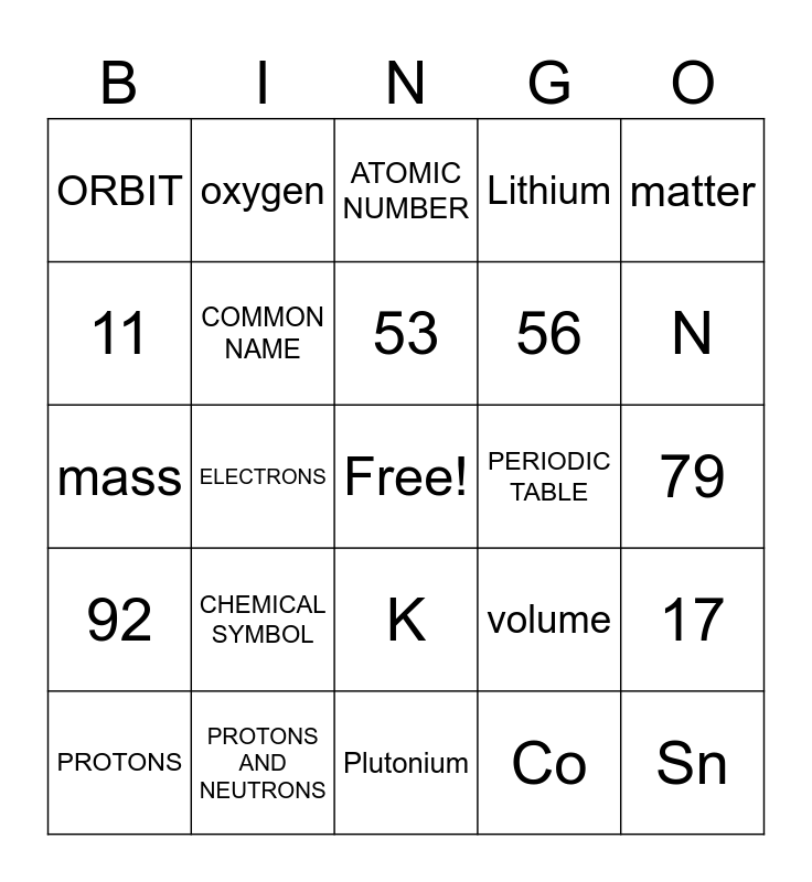 This bingo card has a free space and 29 words: PROTONS, NEUTRONS, ELECTRONS, NUCLEUS, ORBIT, ATOMIC NUMBER, COMMON NAME, CHEMICAL SYMBOL, PERIODIC TABLE, PROTONS AND NEUTRONS, 79, Sn, Plutonium, Co, N, 1, K, 92, matter, mass, volume, Hg, 56, 11, Lithium, oxygen, 17, 53 and 82.
