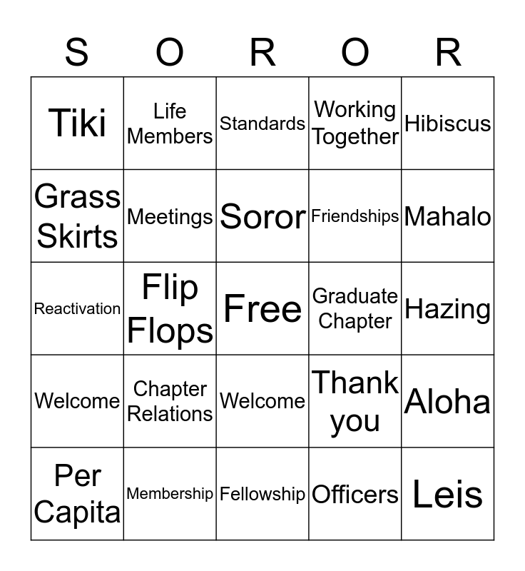 This bingo card has a free space and 24 words: Chapter Relations, Membership, Soror, Per Capita, Hibiscus, Tiki, Grass Skirts, Life Members, Graduate Chapter, Welcome, Friendships, Reactivation, Thank you, Aloha, Meetings, Officers, Hazing, Standards, Mahalo, Flip Flops, Leis, Welcome, Working Together and Fellowship.