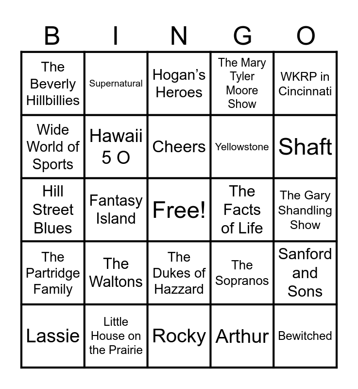 This bingo card has a free space and 40 words: The Monkees, Hill Street Blues, Chips, Hawaii 5 O, Little House on the Prairie, The Dukes of Hazzard, Cheers, Taxi, WKRP in Cincinnati, The Partridge Family, Fantasy Island, The Mary Tyler Moore Show, Bewitched, The Gary Shandling Show, The Facts of Life, The Waltons, Sesame Street, The Beverly Hillbillies, Duck Tales, Hogan’s Heroes, Sanford and Sons, Arthur, Yellowstone, Wide World of Sports, I love Lucy, The Price is Right, Beetlejuice, Laverne & Shirley, S.W.A.T., The Snorks, The Elephant Show, Lassie, The Andy Griffith Show, The Sopranos, Shaft, Rocky, Barney Miller, Sabrina the Teenage Witch, Supernatural and Suite Life of Zack and Cody.
