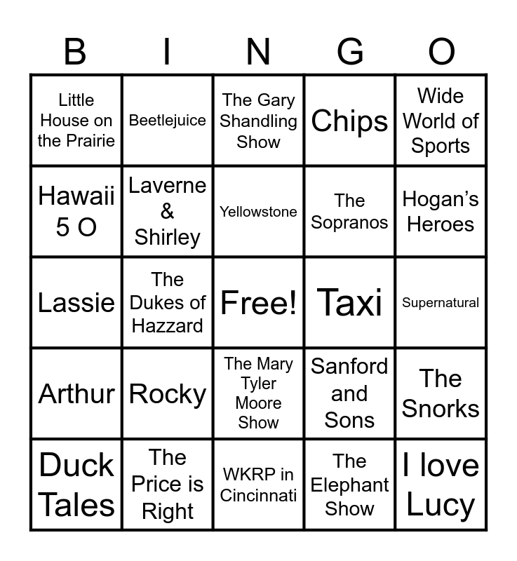 This bingo card has a free space and 40 words: Cheers, Lassie, Suite Life of Zack and Cody, Laverne & Shirley, The Price is Right, The Mary Tyler Moore Show, Yellowstone, Hill Street Blues, Wide World of Sports, Arthur, The Dukes of Hazzard, Chips, I love Lucy, Supernatural, Taxi, Rocky, Barney Miller, Little House on the Prairie, The Waltons, The Gary Shandling Show, The Snorks, The Elephant Show, The Sopranos, Hawaii 5 O, Bewitched, The Andy Griffith Show, The Facts of Life, Sesame Street, Fantasy Island, S.W.A.T., Sabrina the Teenage Witch, Duck Tales, The Monkees, Sanford and Sons, Hogan’s Heroes, WKRP in Cincinnati, Shaft, The Beverly Hillbillies, Beetlejuice and The Partridge Family.
