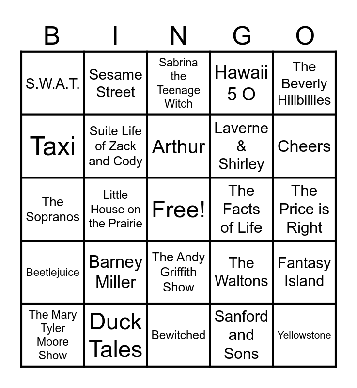 This bingo card has a free space and 40 words: The Snorks, The Sopranos, I love Lucy, Suite Life of Zack and Cody, Duck Tales, The Andy Griffith Show, Arthur, Rocky, The Beverly Hillbillies, Beetlejuice, Little House on the Prairie, Hawaii 5 O, Yellowstone, The Price is Right, The Facts of Life, Barney Miller, Hill Street Blues, S.W.A.T., The Monkees, Sabrina the Teenage Witch, Fantasy Island, Sanford and Sons, Laverne & Shirley, Taxi, The Elephant Show, Lassie, The Partridge Family, The Gary Shandling Show, WKRP in Cincinnati, The Dukes of Hazzard, Chips, The Mary Tyler Moore Show, Supernatural, The Waltons, Cheers, Bewitched, Hogan’s Heroes, Shaft, Sesame Street and Wide World of Sports.