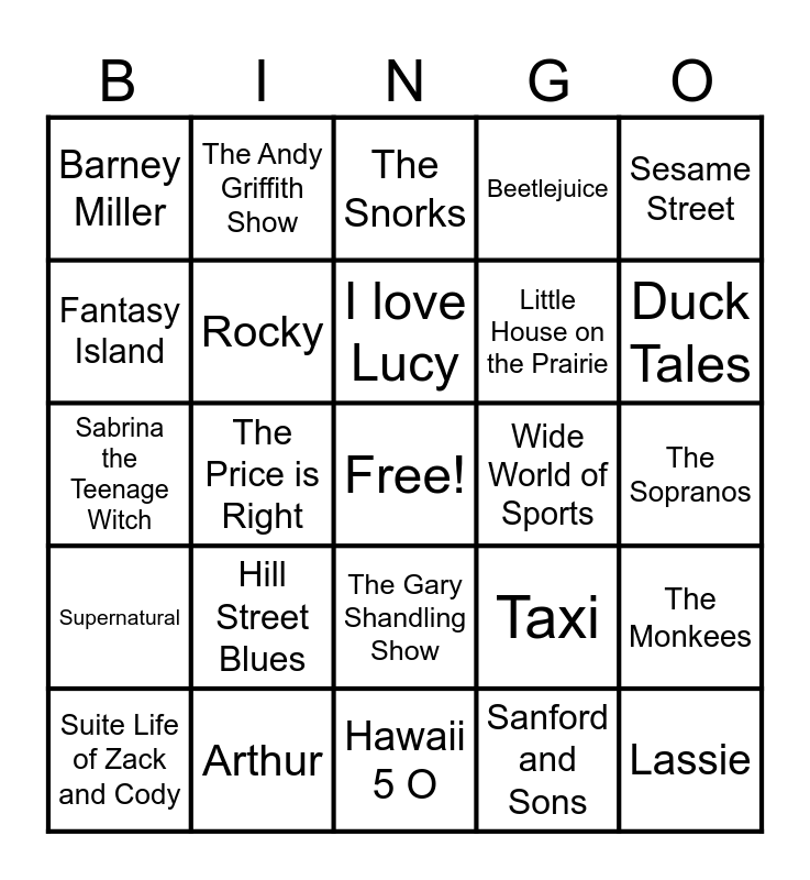 This bingo card has a free space and 40 words: Laverne & Shirley, Sabrina the Teenage Witch, Shaft, Rocky, Arthur, The Gary Shandling Show, I love Lucy, The Beverly Hillbillies, Sesame Street, Supernatural, The Price is Right, Beetlejuice, Lassie, The Sopranos, Wide World of Sports, Hill Street Blues, Hogan’s Heroes, Barney Miller, Cheers, The Snorks, The Monkees, Sanford and Sons, Little House on the Prairie, Fantasy Island, Chips, WKRP in Cincinnati, The Partridge Family, The Dukes of Hazzard, The Facts of Life, The Elephant Show, Bewitched, Suite Life of Zack and Cody, The Waltons, Taxi, Duck Tales, Hawaii 5 O, S.W.A.T., Yellowstone, The Andy Griffith Show and The Mary Tyler Moore Show.