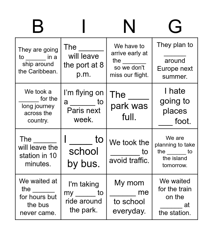 This bingo card has 16 words: I'm taking my _____ to ride around the park., We are planning to take the ______ to the island tomorrow., We have to arrive early at the _______ so we don't miss our flight., They are going to ______ in a ship around the Caribbean., The ______ will leave the station in 10 minutes., The ______ will leave the port at 8 p.m., We took the _______ to avoid traffic., My mom ______ me to school everyday., We took a ______ for the long journey across the country., I’m flying on a ______ to Paris next week., We waited at the ______ for hours but the bus never came., They plan to ______ around Europe next summer., I ____ to school by bus., I hate going to places ___ foot., The ____ park was full. and We waited for the train on the ______ at the station..