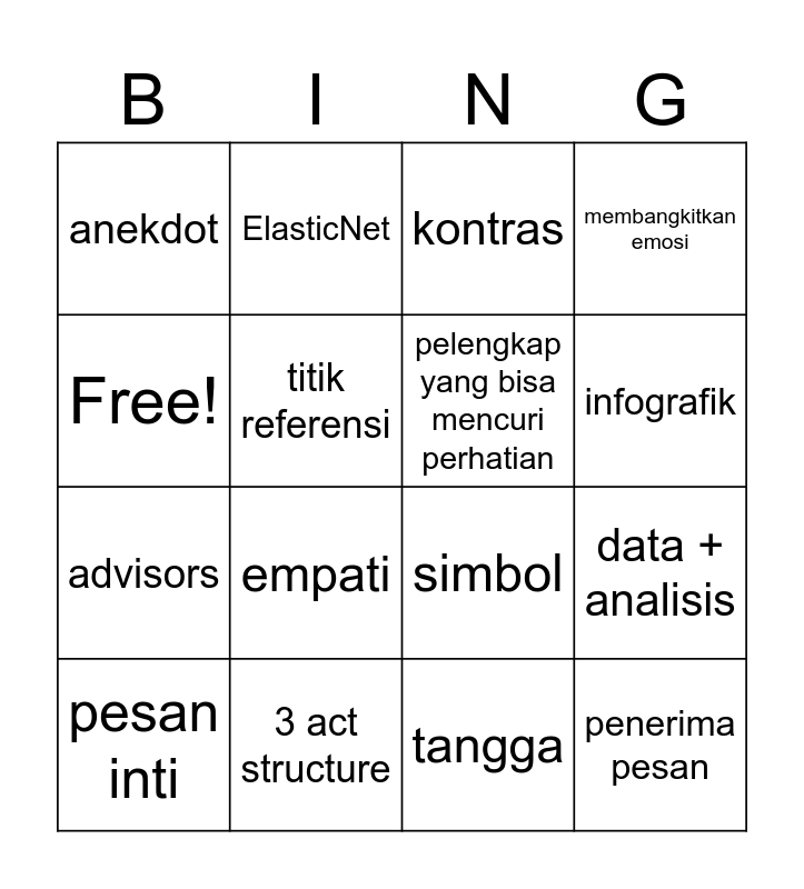 This bingo card has 16 words: 3 act structure, data + analisis, kontras, anekdot, advisors, ElasticNet, simbol, tangga, Free!, titik referensi, pesan inti, membangkitkan emosi, empati, infografik, pelengkap yang bisa mencuri perhatian and penerima pesan.