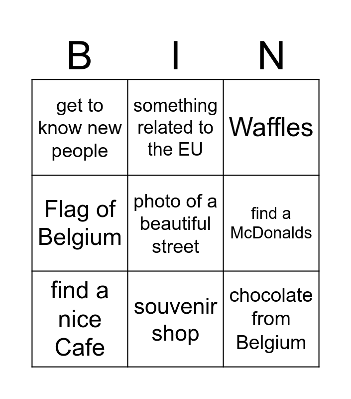 This bingo card has 9 words: find a nice Cafe, Waffles, something related to the EU, Flag of Belgium, get to know new people, find a McDonalds, photo of a beautiful street, chocolate from Belgium and souvenir shop.