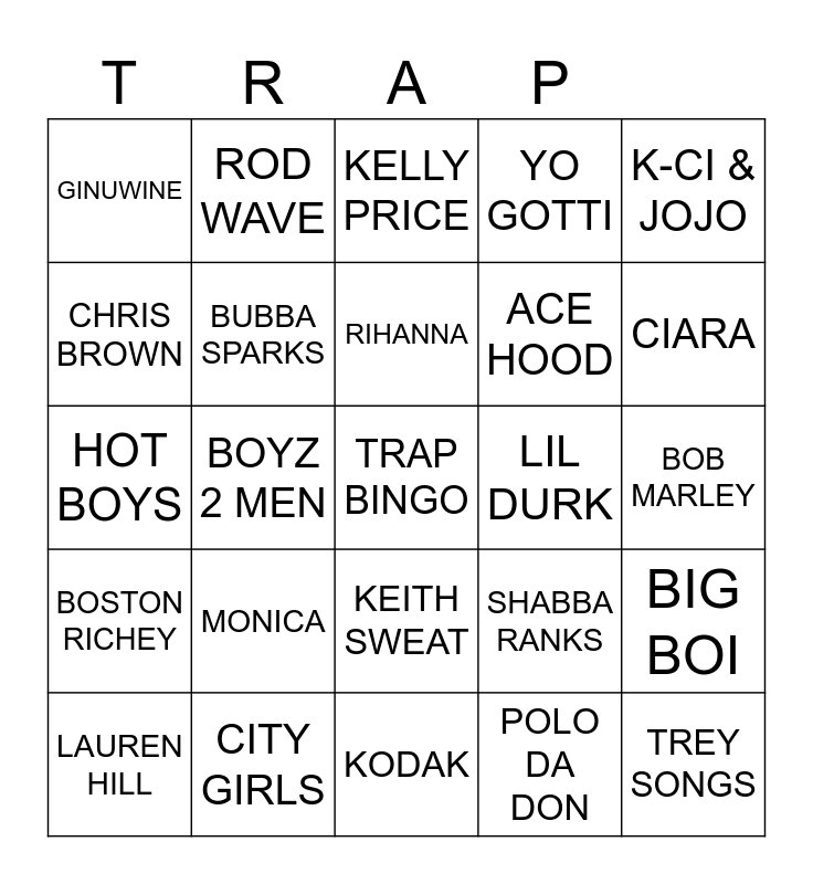 This bingo card has a free space and 28 words: BIG BOI, NELLY, ACE HOOD, POLO DA DON, CHRIS BROWN, KELLY PRICE, ROD WAVE, BOSTON RICHEY, LIL DURK, LAUREN HILL, HOT BOYS, YO GOTTI, CITY GIRLS, KODAK, CIARA, FUTURE, MONICA, BUBBA SPARKS, RIHANNA, KEITH SWEAT, GINUWINE, SILK, TREY SONGS, BOYZ 2 MEN, BOB MARLEY, SHABBA RANKS, K-CI & JOJO and FRIDAYY.