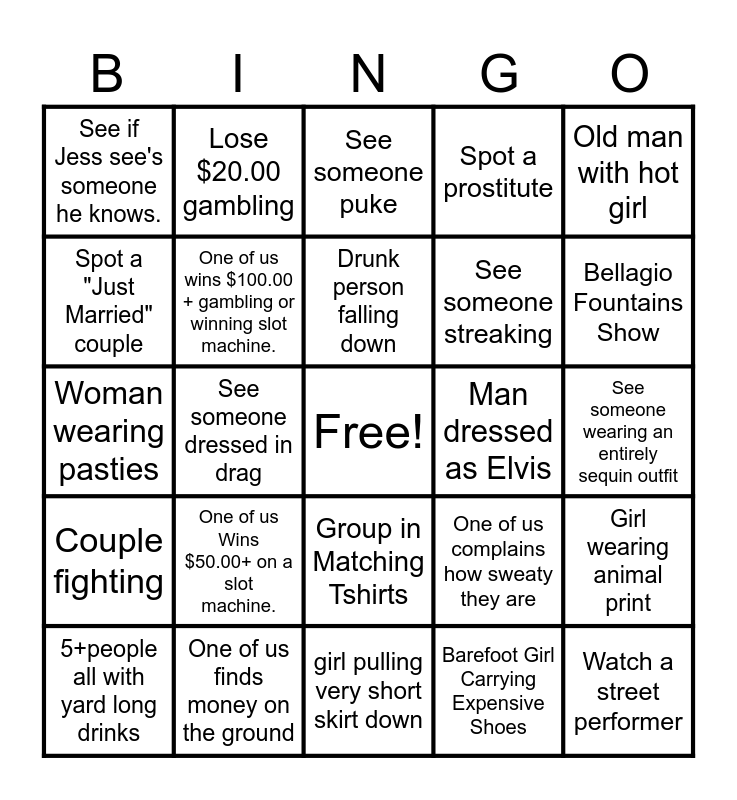 This bingo card has a free space and 24 words: One of us Wins $50.00+ on a slot machine., One of us finds money on the ground, Drunk person falling down, 5+people all with yard long drinks, Old man with hot girl, See if Jess see's someone he knows., Spot a "Just Married" couple, Lose $20.00 gambling, Man dressed as Elvis, Group in Matching Tshirts, See someone streaking, Woman wearing pasties, One of us complains how sweaty they are, Girl wearing animal print, One of us wins $100.00 + gambling or winning slot machine., Barefoot Girl Carrying Expensive Shoes, See someone wearing an entirely sequin outfit, See someone puke, Bellagio Fountains Show, See someone dressed in drag, Watch a street performer, Couple fighting, Spot a prostitute and girl pulling very short skirt down.