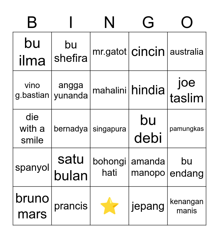 This bingo card has 25 words: spanyol, prancis, singapura, jepang, australia, bu ilma, bu shefira, mr.gatot, bu debi, bu endang, vino g.bastian, angga yunanda, ⭐, amanda manopo, joe taslim, bruno mars, bernadya, mahalini, hindia, pamungkas, die with a smile, satu bulan, bohongi hati, cincin and kenangan manis.