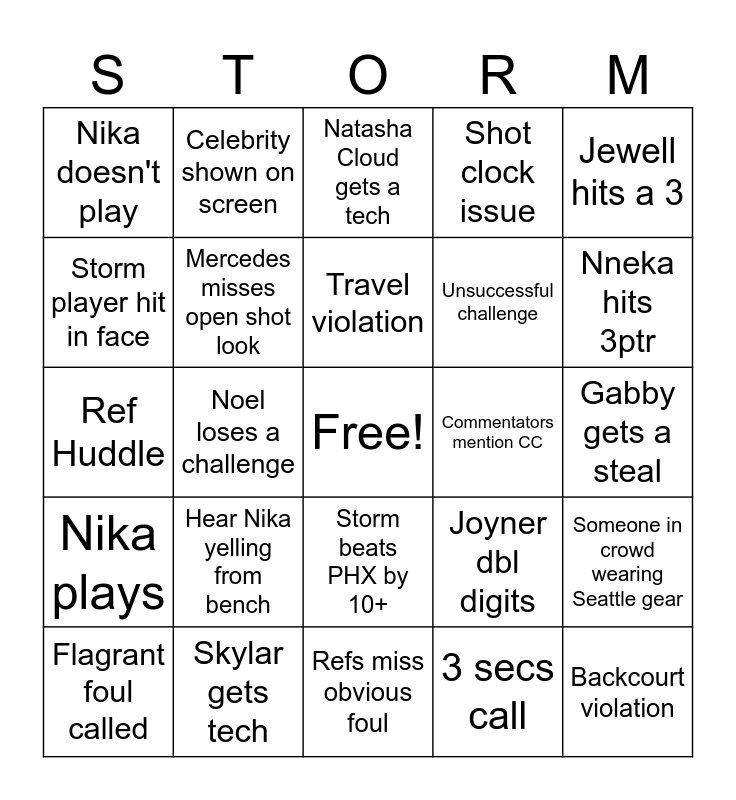 This bingo card has a free space and 30 words: Skylar gets tech, Skylar twirls her finger, Noel loses a challenge, Nika scores her 1st points, Nika doesn't play, Natasha Cloud gets a tech, Mercedes misses open shot look, Storm beats PHX by 10+, Commentators mention CC, Refs miss obvious foul, Gabby gets a steal, Backcourt violation, 3 secs call, DT retirement announcement, Nneka hits 3ptr, Skylar fastbreak layup, Joyner dbl digits, Nika plays, Hear Nika yelling from bench, Jewell hits a 3, Ref Huddle, Mascot appearance, Celebrity shown on screen, Unsuccessful challenge, Storm player hit in face, Shot clock issue, Someone in crowd wearing Seattle gear, Flagrant foul called, Travel violation and Shot clock violation.