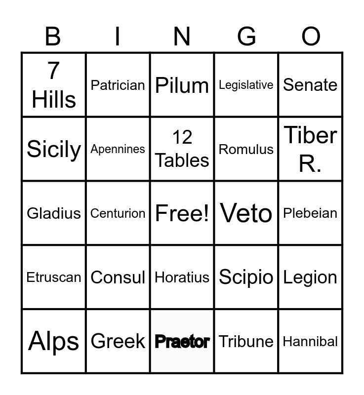 This bingo card has a free space and 24 words: Consul, Greek, 12 Tables, Alps, Senate, 7 Hills, Sicily, Patrician, Veto, Horatius, Romulus, Gladius, Scipio, Legion, Apennines, Tribune, Plebeian, Pilum, Tiber R., Centurion, Hannibal, Etruscan, Legislative and Praetor.
