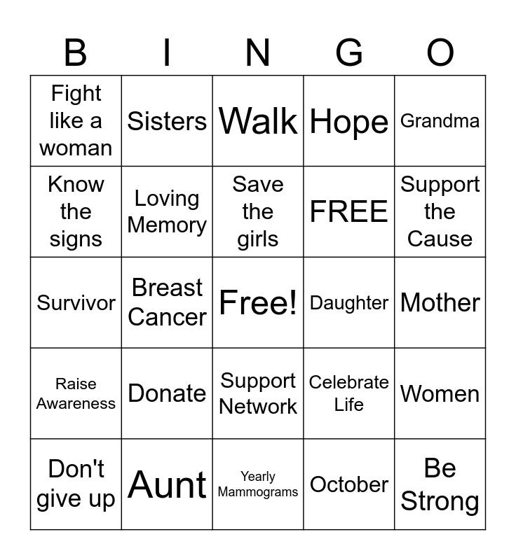 This bingo card has a free space and 25 words: Donate, Yearly Mammograms, Save the girls, Don't give up, Grandma, Fight like a woman, Know the signs, Sisters, Daughter, Support Network, FREE, Survivor, Celebrate Life, Women, Loving Memory, Pink, Mother, Walk, Support the Cause, Breast Cancer, Be Strong, Aunt, Raise Awareness, Hope and October.
