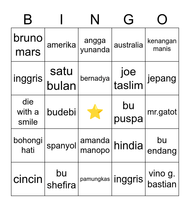 This bingo card has a free space and 24 words: spanyol, bu shefira, bernadya, cincin, kenangan manis, bruno mars, inggris, amerika, bu puspa, amanda manopo, joe taslim, die with a smile, hindia, bu endang, satu bulan, inggris, mr.gatot, angga yunanda, jepang, budebi, vino g. bastian, bohongi hati, australia and pamungkas.