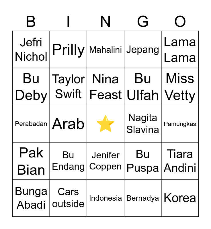This bingo card has a free space and 24 words: Bu Endang, Cars outside, Nina Feast, Bunga Abadi, Lama Lama, Jefri Nichol, Bu Deby, Prilly, Nagita Slavina, Jenifer Coppen, Bu Ulfah, Perabadan, Bu Puspa, Tiara Andini, Taylor Swift, Bernadya, Pamungkas, Mahalini, Miss Vetty, Arab, Korea, Pak Bian, Jepang and Indonesia.