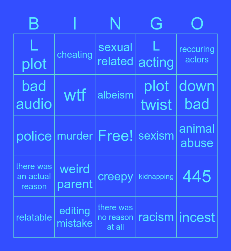 This bingo card has a free space and 24 words: weird parent, editing mistake, albeism, relatable, reccuring actors, L plot, bad audio, cheating, sexism, creepy, plot twist, police, kidnapping, 445, wtf, racism, animal abuse, sexual related, down bad, murder, incest, there was an actual reason, L acting and there was no reason at all.