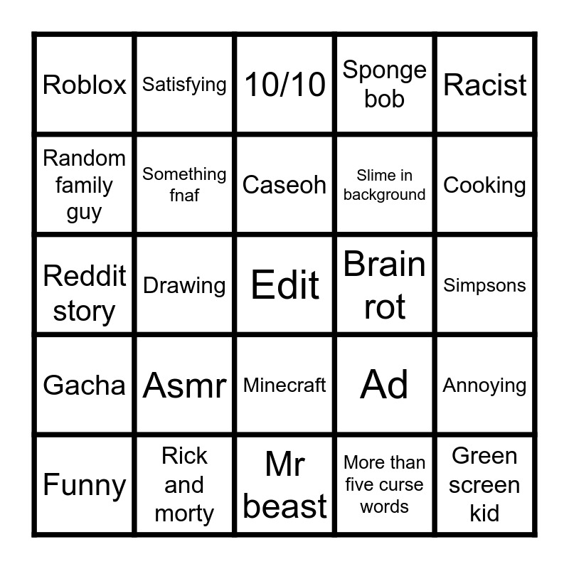 This bingo card has 25 words: Asmr, Mr beast, Caseoh, Funny, Racist, Roblox, Random family guy, Satisfying, Brain rot, Minecraft, Slime in background, Reddit story, Ad, Annoying, Something fnaf, Green screen kid, Simpsons, 10/10, Cooking, Drawing, Edit, Rick and morty, Gacha, Sponge bob and More than five curse words.