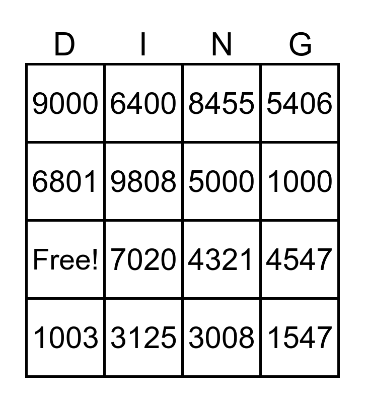 This bingo card has 20 words: 4547, 6400, 8455, 2099, 1003, 6801, 3125, 9000, Free!, 6400, 7020, 4321, 9808, 1547, 5000, 7203, 1000, 5406, 3008 and 9534.