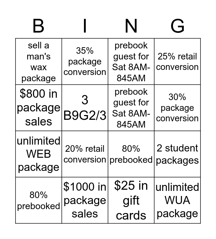 This bingo card has a free space and 15 words: 80% prebooked, unlimited WUA package, prebook guest for Sat 8AM-845AM, sell a man's wax package, 30% package conversion, $800 in package sales, 20% retail conversion, $25 in gift cards, 3 B9G2/3, unlimited WEB package, 2 student packages, 25% retail conversion, prebook guest for Sat 8AM-845AM, 35% package conversion and $1000 in package sales.