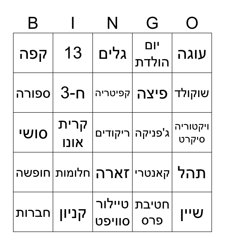 This bingo card has a free space and 24 words: חברות, חלומות, קפיטריה, חטיבת פרס, עוגה, קפה, 13, גלים, ג'פניקה, ויקטוריה סיקרט, סושי, ח-3, קאנטרי, תהל, ספורה, קניון, טיילור סוויפט, יום הולדת, שוקולד, חופשה, קרית אונו, זארה, פיצה and שיין.