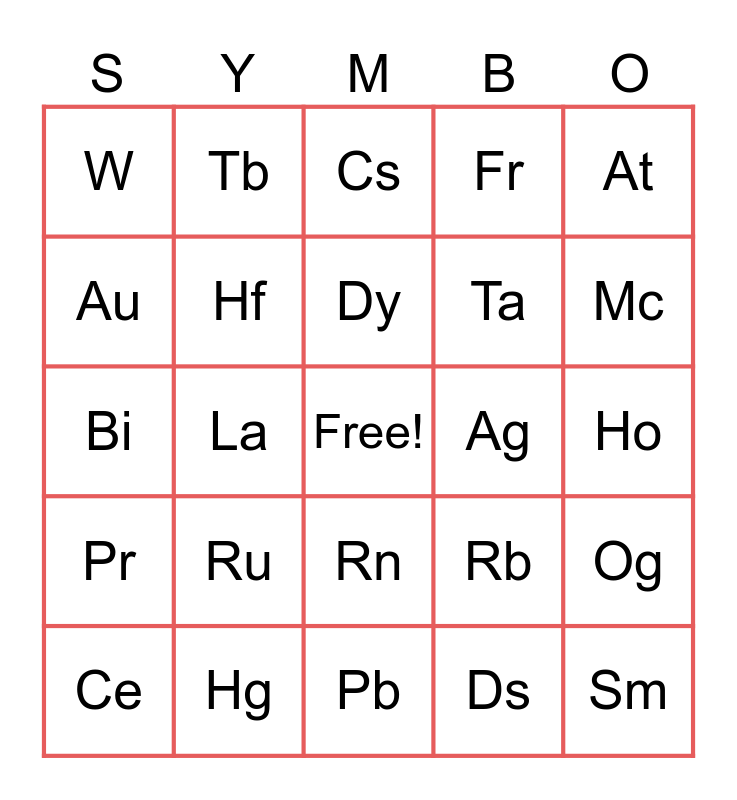 This bingo card has a free space and 24 words: Ru, Hg, Dy, Ce, At, W, Au, Tb, Ag, Rn, Ta, Bi, Rb, Og, Hf, Ds, Ho, Cs, Mc, La, Sm, Pr, Fr and Pb.