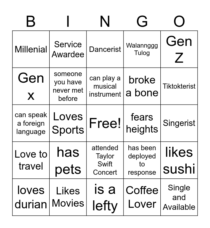 This bingo card has a free space and 25 words: has pets, is a lefty, can play a musical instrument, loves durian, Gen Z, Millenial, Gen x, Service Awardee, fears heights, attended Taylor Swift Concert, broke a bone, can speak a foreign language, has been deployed to response, likes sushi, someone you have never met before, has had stitches, Singerist, Dancerist, Tiktokterist, Loves Sports, Single and Available, Likes Movies, Love to travel, Walannggg Tulog and Coffee Lover.