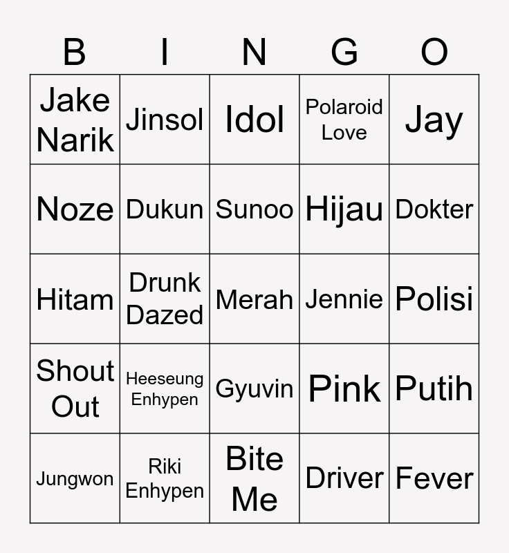 This bingo card has a free space and 24 words: Heeseung Enhypen, Riki Enhypen, Sunoo, Jungwon, Jay, Jake Narik, Noze, Jinsol, Jennie, Gyuvin, Hijau, Hitam, Pink, Putih, Dukun, Driver, Polisi, Idol, Dokter, Drunk Dazed, Fever, Shout Out, Polaroid Love and Bite Me.