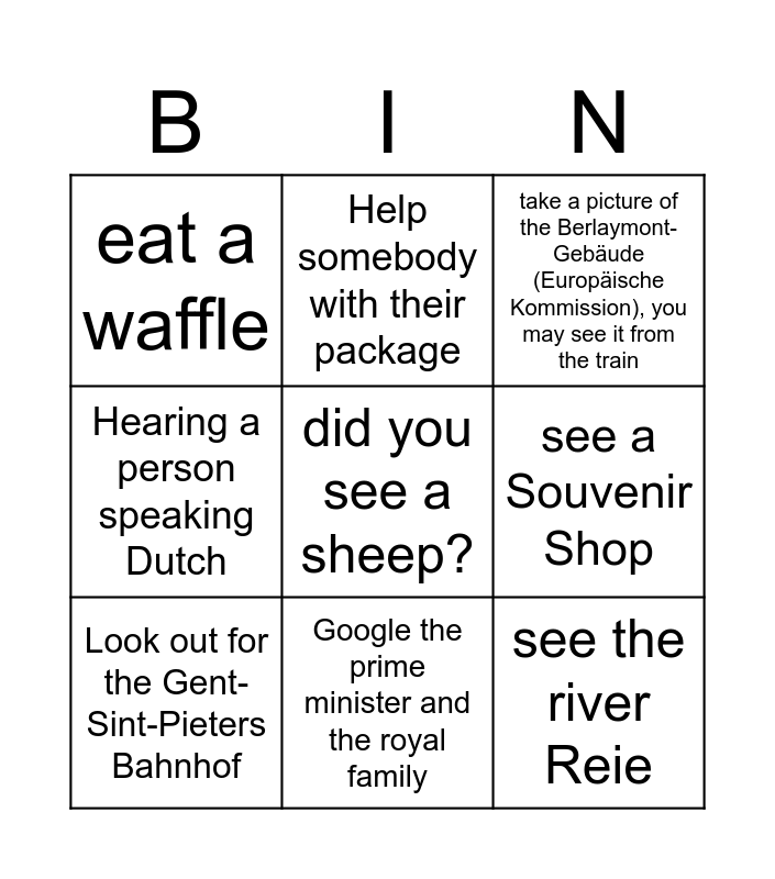 This bingo card has 9 words: Look out for the Gent-Sint-Pieters Bahnhof, did you see a sheep?, take a picture of the Berlaymont-Gebäude (Europäische Kommission), you may see it from the train, eat a waffle, Help somebody with their package, see a Souvenir Shop, Hearing a person speaking Dutch, Google the prime minister and the royal family and see the river Reie.