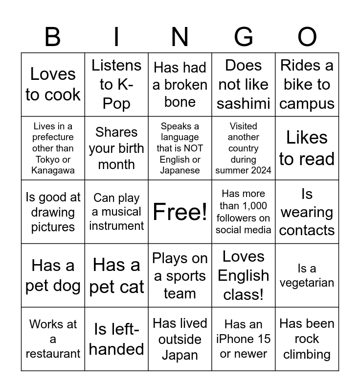 This bingo card has a free space and 25 words: Has a pet cat, Has lived outside Japan, Speaks a language that is NOT English or Japanese, Works at a restaurant, Rides a bike to campus, Loves to cook, Lives in a prefecture other than Tokyo or Kanagawa, Listens to K-Pop, Has more than 1,000 followers on social media, Plays on a sports team, Visited another country during summer 2024, Is good at drawing pictures, Loves English class!, Is a vegetarian, Shares your birth month, Makes their own bento daily, Is wearing contacts, Has had a broken bone, Likes to read, Can play a musical instrument, Has been rock climbing, Is left-handed, Has a pet dog, Does not like sashimi and Has an iPhone 15 or newer.