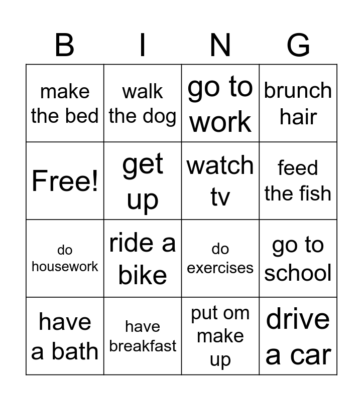 This bingo card has 16 words: have breakfast, go to school, go to work, make the bed, do housework, walk the dog, do exercises, put om make up, Free!, get up, have a bath, brunch hair, ride a bike, feed the fish, watch tv and drive a car.