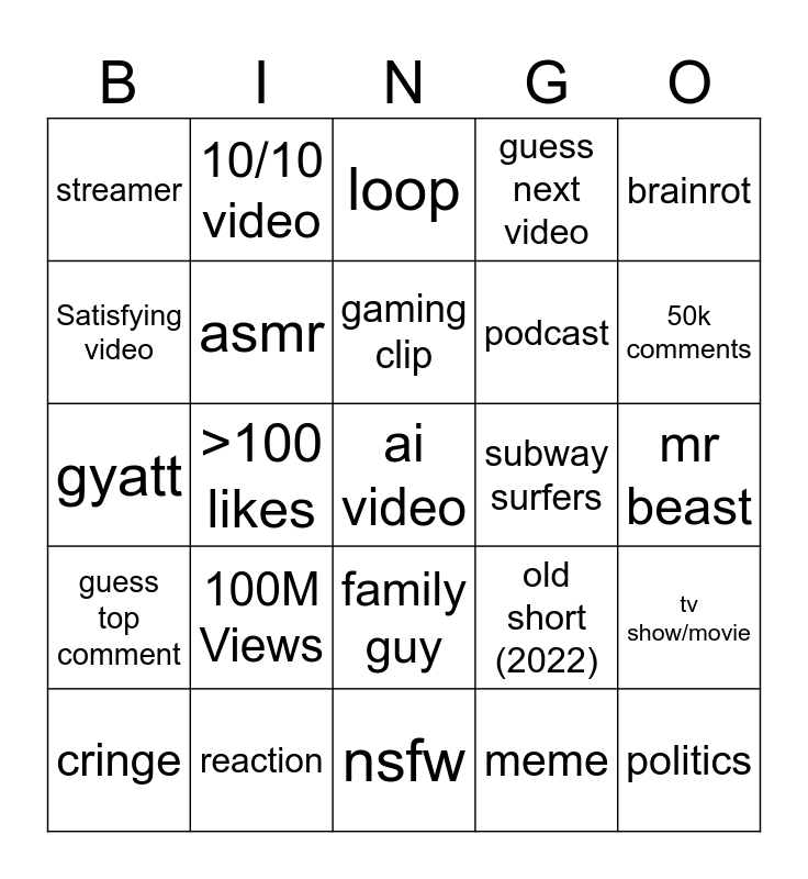 This bingo card has 25 words: 100M Views, nsfw, gaming clip, cringe, brainrot, streamer, Satisfying video, 10/10 video, subway surfers, family guy, podcast, gyatt, old short (2022), tv show/movie, asmr, politics, mr beast, loop, 50k comments, >100 likes, ai video, reaction, guess top comment, guess next video and meme.