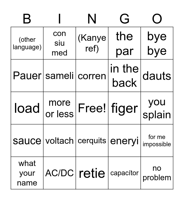 This bingo card has a free space and 24 words: voltach, AC/DC, corren, what your name, bye bye, (other language), Pauer, con siu med, figer, cerquits, in the back, load, eneryi, for me impossible, sameli, capacítor, you splain, (Kanye ref), dauts, more or less, no problem, sauce, the par and retie.