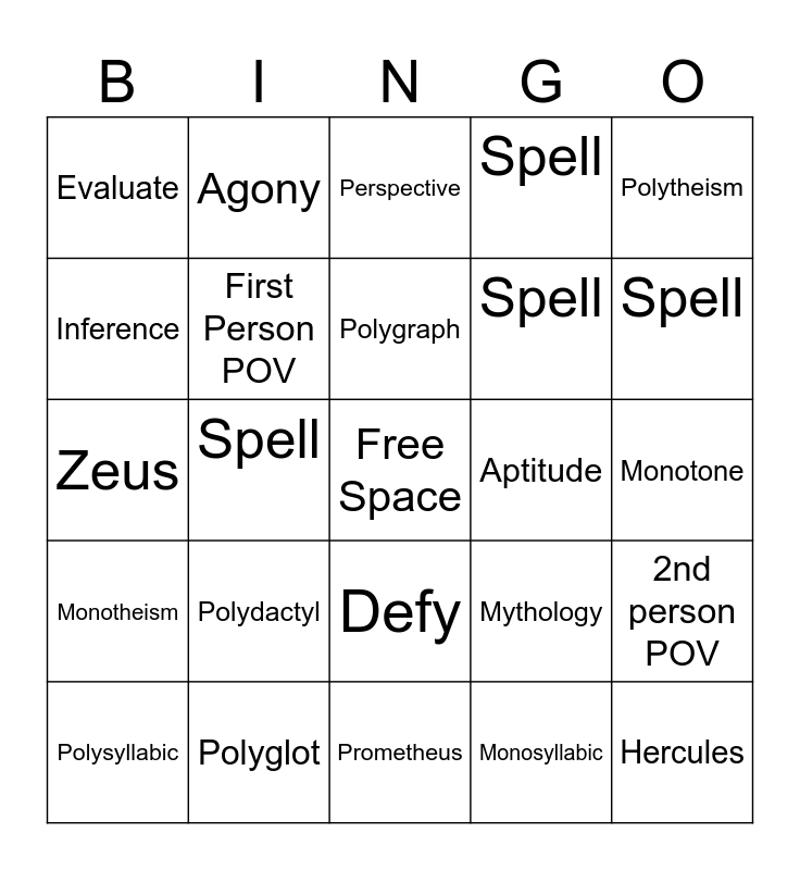 This bingo card has a free space and 24 words: Polydactyl, Polyglot, Polygraph, Polysyllabic, Polytheism, Evaluate, Inference, Agony, Aptitude, Defy, Spell, Zeus, Mythology, 2nd person POV, First Person POV, Monosyllabic, Monotone, Perspective, Spell, Spell, Hercules, Monotheism, Spell and Prometheus.