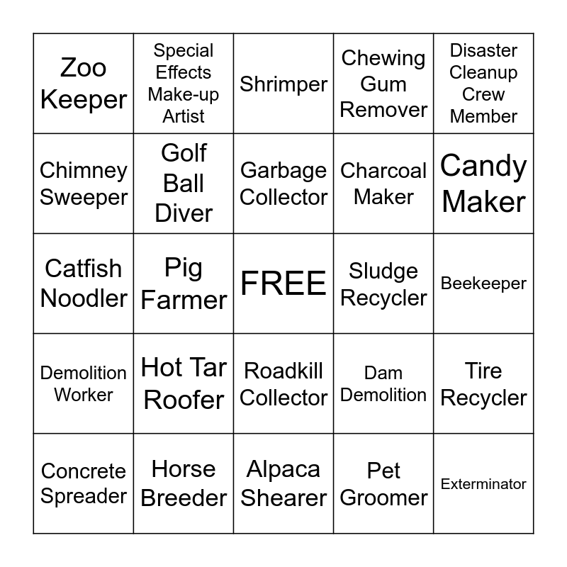 This bingo card has a free space and 40 words: Fish Gutter, Catfish Noodler, Septic Tank Technician, Golf Ball Diver, Horse Breeder, Roadkill Collector, Garbage Collector, Sewer Inspector, Disaster Cleanup Crew Member, Demolition Worker, Pig Farmer, Chewing Gum Remover, Exterminator, Beekeeper, Sludge Recycler, Hot Tar Roofer, Marine Mammal Rescuer, Zoo Keeper, Cheese Maker, Shrimper, Tire Recycler, Pet Groomer, Charcoal Maker, Chimney Sweeper, Underwater Logger, Cattle Rancher, Potato Farmer, Alligator Farmer, Storm Drain Cleaner, Plumber, Rough Necker, Concrete Spreader, Terra Cotta Facade Maker, Dam Demolition, Candy Maker, Alpaca Shearer, Bell Maker, Exotic Insect Breeder, Special Effects Make-up Artist and Oyster Harvester.